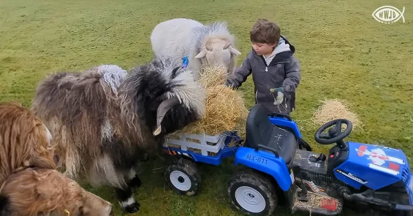 What makes the moment so touching isn’t just the setting—it’s the way Oliver handles his task. Despite his age, he shows remarkable focus and care. He doesn’t rush. He doesn’t let the animals’ excitement throw him off. One by one, he carefully stops and distributes the hay, making sure each group gets its share. The goats, naturally curious and mischievous, nudge the trailer and try to sneak bites before the hay is on the ground. But Oliver stays calm, gently brushing them aside and moving forward, his small hands confidently placing portions of hay along the way.