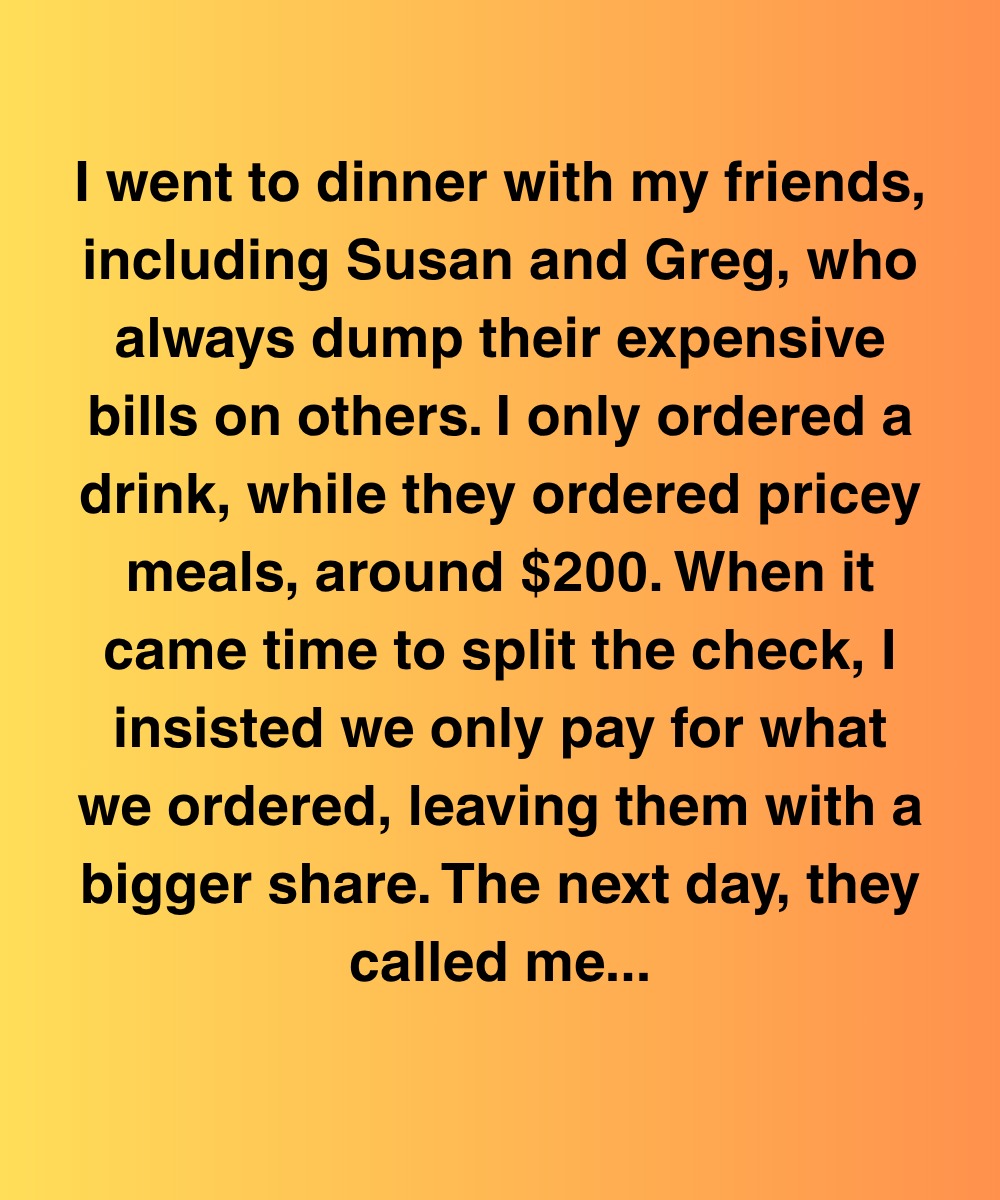 I went to dinner with my friends, including Susan and Greg, who always dump their expensive bills on others. I only ordered a drink, while they ordered pricey meals, around $200. When it came time to split the check, I insisted we only pay for what we ordered, leaving them with a bigger share. The next day, they called me…